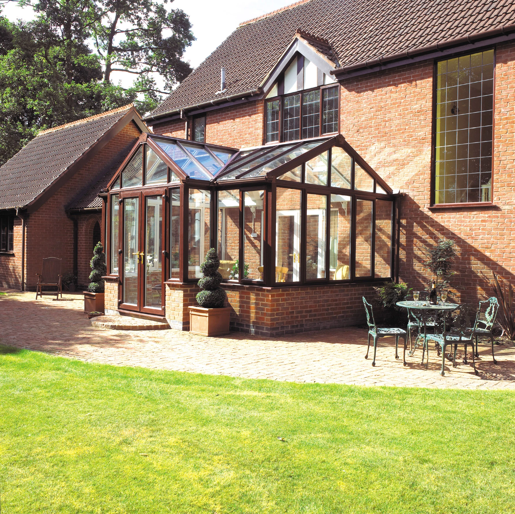 The double-hipped conservatory is an ideal compromise between style and a seamless fit with the home. The double hip as it is known means that the pitched roof appears on both sides of the conservatory, rather than having a flat face connecting to the house wall.
