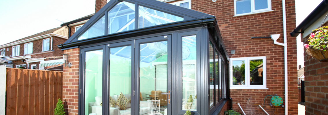 All Gable conservatories are available in our range of Liniar colours and the addition of a Bi-Folding door or French Doors can be a modern enhancement to this conservatory design.